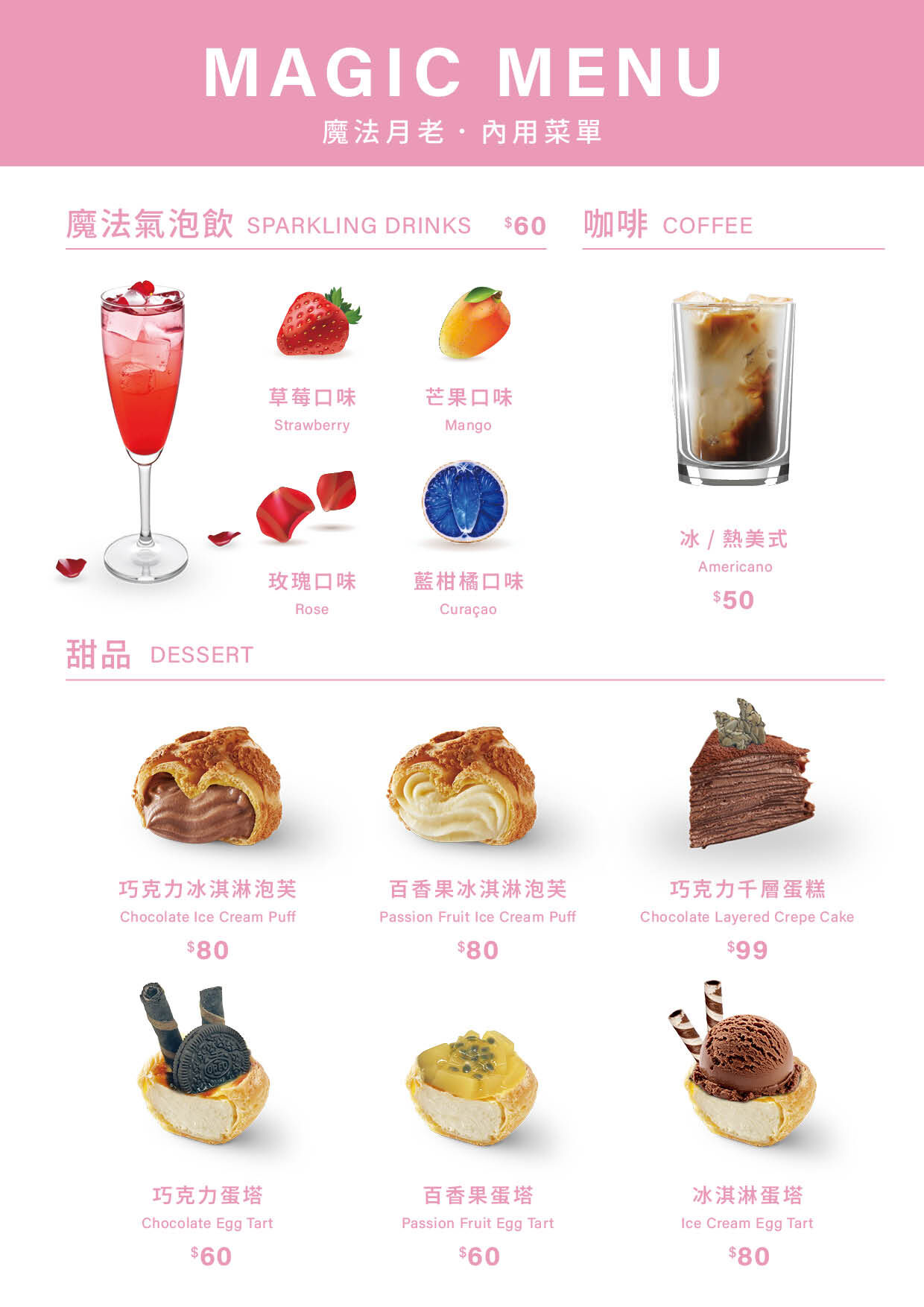 魔法月老提供多種氣泡飲和點心,悠閒的喝一杯藍柑橘魔法氣泡飲,加上一個草莓芝士蛋糕冰淇淋蛋塔,讓今天的約會更加甜蜜。